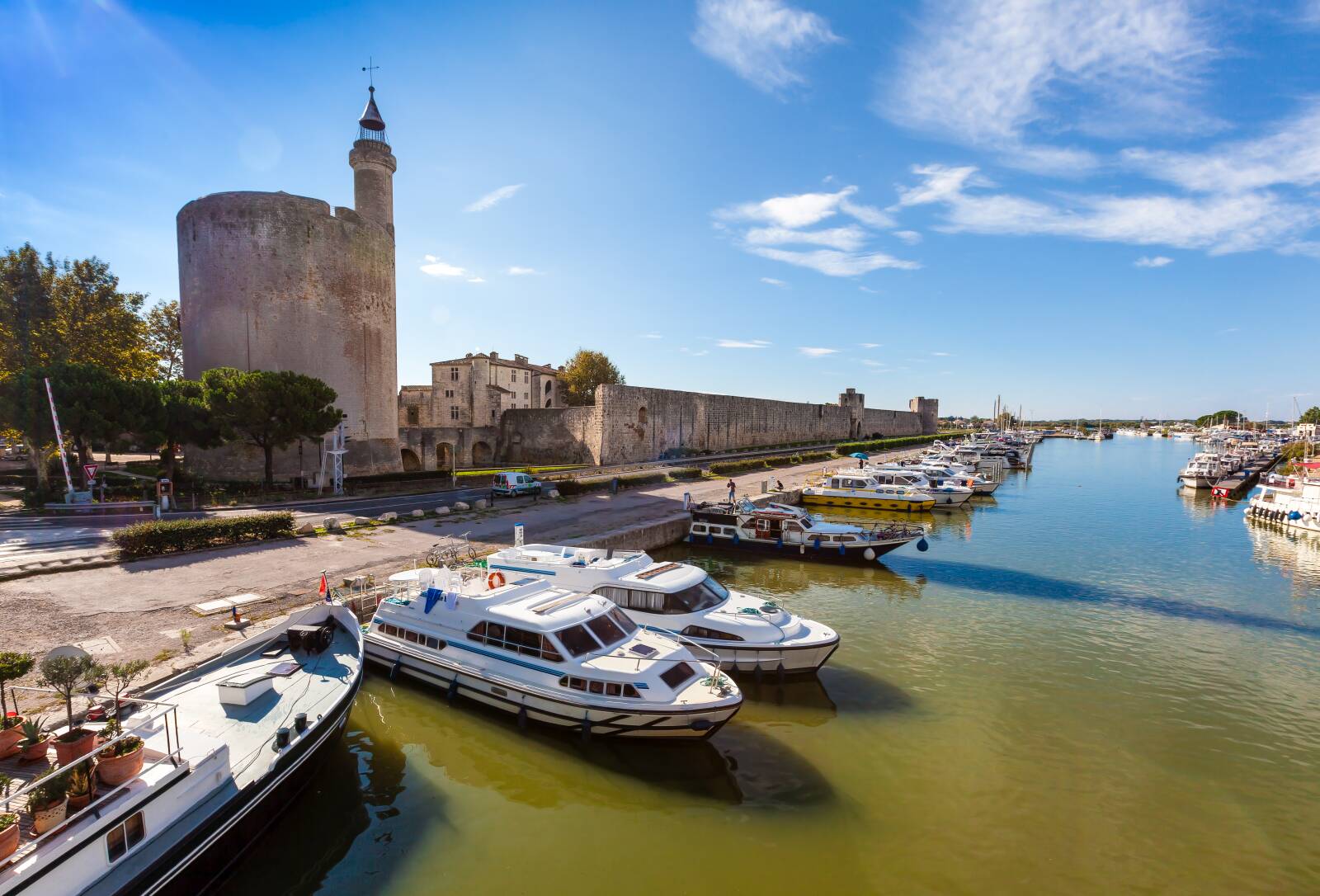 In the Camargue region, a river cruise also becomes a historical journey with the city of Aigues-Mortes. Founded in the 13th century by King Saint Louis, the city was once the main royal port leading to the Mediterranean. Today, its perfectly preserved medieval walls surround a charming historic centre. From the Rhône-to-Sète Canal, arriving in Aigues-Mortes on a licence-free boat is impressive: the medieval towers appear in the middle of the salt marshes.